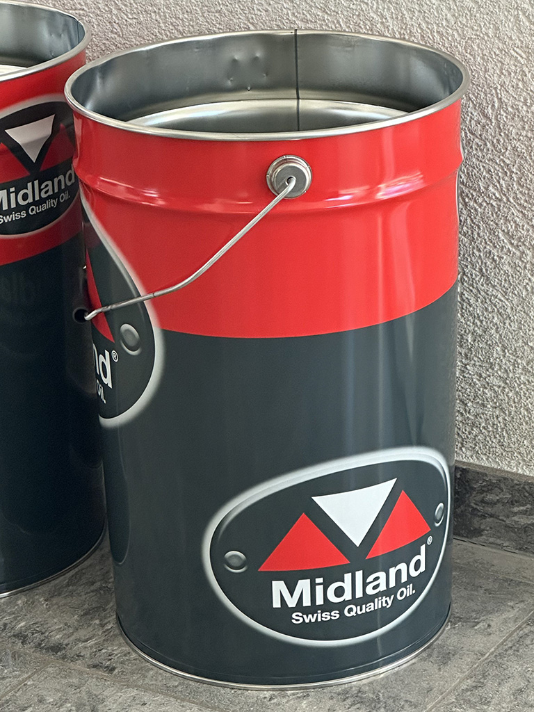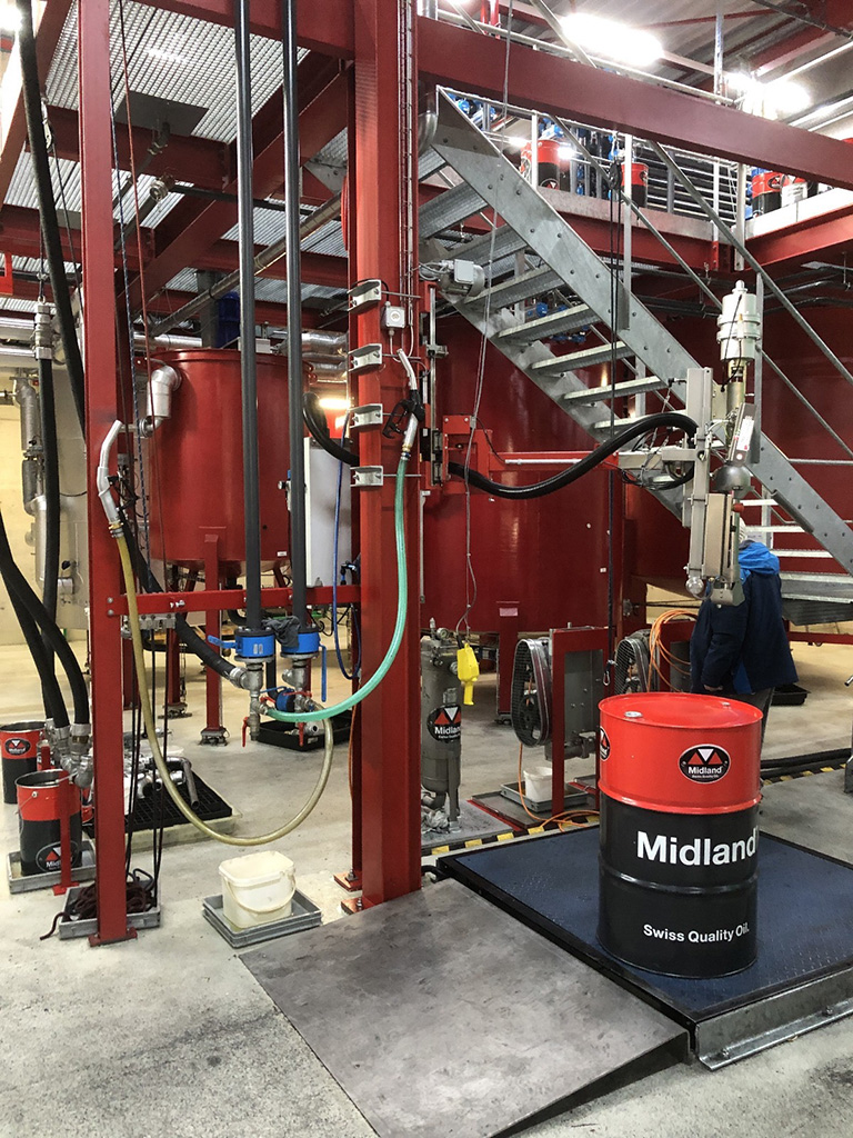 Lukas Noth, Verkaufsleiter, begrüsste die Gästeschar herzlich und stellte Fredi Brack vor, Teilhaber der Oel-Brack AG, sowie dessen Neffen Daniel Brack, Betriebsleiter. Dani und sein Onkel Fredi führten uns zu einem einstündigen Rundgang durch den Betrieb. Dabei erklärten sie ausführlich den Produktionsablauf und die ganze Entwicklung von den Anfängen bis in die Neuzeit. Zunächst ging es in die ehemalige stillgelegte Produktionshalle, wo noch einige Tanks und Mischanlagen stehen. Danach kamen wir ins Staunen, als uns Dani in die grosse Lagerhalle führte, wo sich gigantisch viele Fässer, auf Paletten gestapelt, türmten. Die einen sind für die Lieferung bereitgestellt, die anderen als Reserve gehalten, um jederzeit lieferbereit zu sein. Midland Oil liefert nach eigenen Angaben in 20 verschiedene Länder, vorwiegend nach Skandinavien, Zentral- und Osteuropa. Am Ende kamen wir im Zentrum der Produktionsanlage an. Von Grundöl- und Additivtanks führen Leitungen zur Mischanlage über das Herzstück, ein Terminal. Dieses steuert die Ventile, Pumpen, Heizung, sowie die Rührwerke und stellt damit die exakte Mischung nach Rezepten sicher. In mehreren eigens hergestellten Abfüllanlagen werden die verschieden grossen Gebinde gefüllt. Die laufende Produktion konnten wir zwar nicht miterleben, weil die Lärmentwicklung zu heftig gewesen wäre, aber wir konnten einen vertieften Einblick in die Produktion gewinnen.